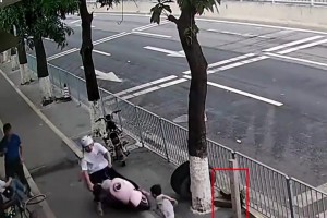 孩子突然过马路周围没有家长看着,电瓶车躲避不及差点撞上