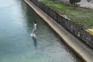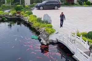 一家人站在水边合影,妈妈拽儿子时意外把女儿撞得掉了下去