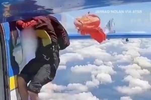 国外男子玩跳伞,还在机舱里降落伞意外打开,导致男子被挂在机翼